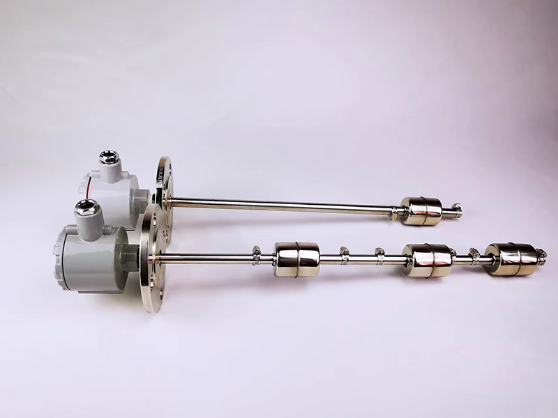 干簧管式浮球液位計工作原理:干簧管式浮球液位計由浮球、插桿等組成。浮球液位計通過連接法蘭安裝于容器頂上,浮球根據(jù)排液體體積相等等原理浮于液面,當(dāng)容器的液位變化時浮球也隨著上下移動,由于磁性作用,浮球液位計的干簧受磁性吸合,把液面位置變化成電信號,通過顯示儀表用數(shù)字顯示液體的實際位置,浮球液位計從而達(dá)到液面的遠(yuǎn)距離檢測和控制。浮球變送器上的浮球隨液位上下浮動,使傳感器得到正比于液位的電阻信號,經(jīng)轉(zhuǎn)換放大變送輸出DC4 -20mA的標(biāo)準(zhǔn)信號。可與多種二次儀表或計算機構(gòu)成對液位進(jìn)行遠(yuǎn)距離調(diào)節(jié)的測量,顯示和控制系統(tǒng)。